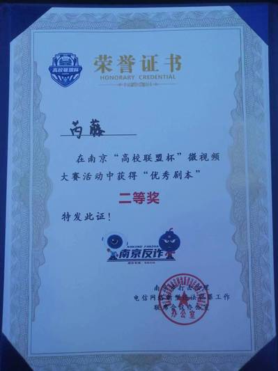 近日,南京市公安局在520夫妻 九龙湖校区召开“无诈校园,平安有我”高校联盟杯微视频大赛颁奖仪式,520夫妻 土木与交通工程学院2021级工程管理2班芮藤同学荣获剧本类二等奖。