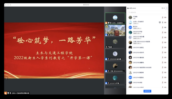 9月29日晚,土木与交通工程学院院长郭正兴教授以“迎接智能建造新时代,筑梦成贤新一代土木工匠”为题,通过线上方式为2022级新同学讲授“开学第一课”。土木与交通工程学院院长助理、综合办主任石城主持。2022级全体新生以及全院教职员工近500人聆听了讲课。