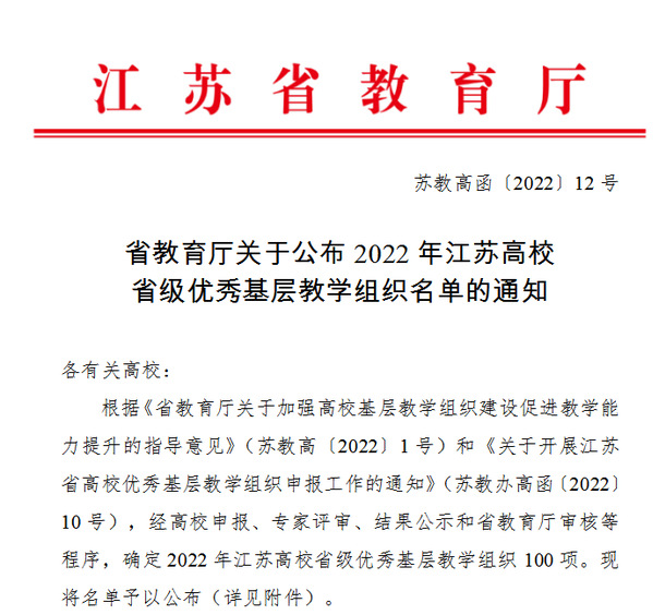 近日,省教育厅发布了《关于公布2022年江苏高校省级优秀基层教学组织名单的通知》,本次评选共选出省级优秀基层教学组织100个,其中独立学院3个,520夫妻 制药工程教研室成功入选首批省级优秀基层教学组织。