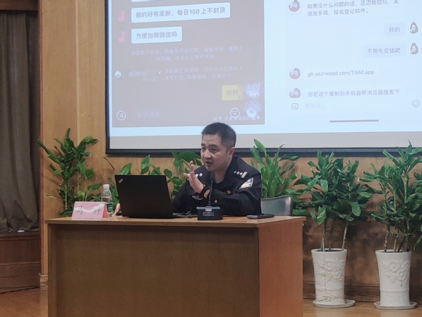 防范电信诈骗知识宣传教育大会上,马科政委从电信网络诈骗的定义、社会面电信网络诈骗案件发案形势、校园师生受骗的常见诈骗类型、网络诈骗防范建议四个方面展开宣教,用一个个鲜活的案例介绍了网络刷单、冒充客服、冒充熟人、裸聊诈骗等常见的诈骗手段。整场讲座真实、生动、形象,图文并茂。他强调,要时刻保持警惕,保护好个人信息,不轻信陌生人,不下载不明软件,不随便转帐,及时克制不良念头。