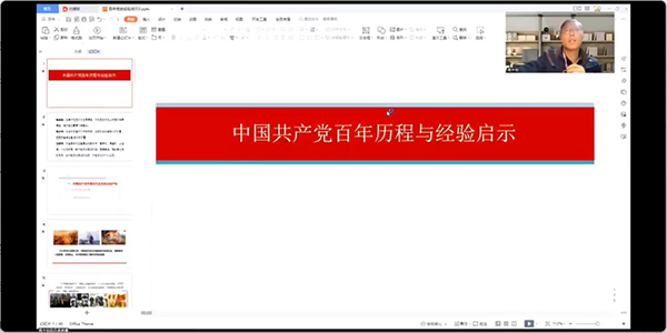 周中明教授以“中国共产党百年经历与经验启示”为主题,回顾了中国共产党的百年发展历程系统介绍了我们党践行伟大建党精神的百年征程和深刻启示周教授引经据典,告诉同学们思想上不能固步自封,要积极接受新思想、新信息,同时把握好当下局势,坚持实事求是。习近平总书记强调指出,人民是历史的创造者,是决定党和国家前途命运的根本力量。因此,周教授阐释了“水可载舟,亦可覆舟”的道理,呼吁同学们要牢记“逆水行舟,不进则退”的意思,深刻把握“两个确立”坚决做到“两个维护”发扬斗争精神增进团结统一