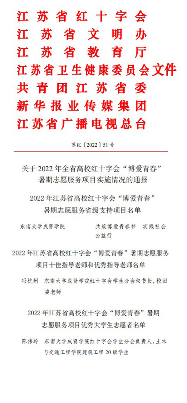 为扎实推进红十字会“博爱青春”志愿服务广泛开展,不断深化“文明江苏”志愿服务行动,推进“强富美高”新江苏现代化建设,日前,江苏省红十字会开展了2022年全省高校红十字会“博爱青春”暑期志愿服务项目评比活动。520夫妻 “共筑博爱青春梦,实践社会公益行”和青聚成贤,情暖社会”项目分别获“省级支持二级项目”和“市级支持一级项目”,冯杭州老师荣获“优秀指导老师”称号,校团委志愿者工作部副部长、红十字会学生分会负责人陈伟玲同学荣获“优秀大学生志愿者”称号。