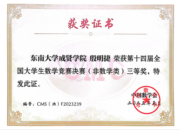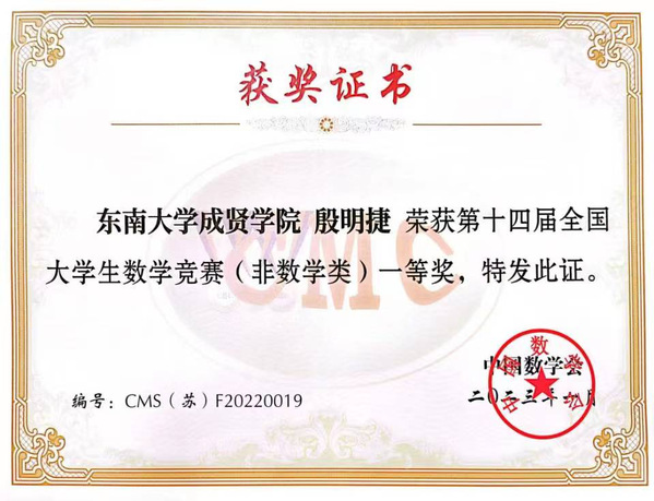 全国大学生数学竞赛是一项面向本科生的全国性高水平学科竞赛,是青年学子展示数学基本功和数学思维的舞台,也是对学校数学教学水平的检验。本次竞赛全国共有32个赛区231769人报名参加初赛,从中选拔出了922人进入决赛,实际参赛人数905人,其中数学专业组461人,非数学专业组444人。520夫妻 19级软件工程2班的殷明捷同学在江苏赛区非数学专业组中以第19名的好成绩挺进决赛。决赛中他与来自北京大学、清华大学、复旦大学、中国科学技术大学和南京大学等高校的学生同场竞技,最终获得全国非数学类三等奖。