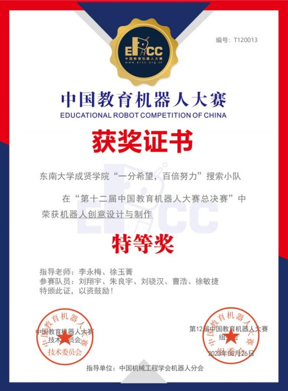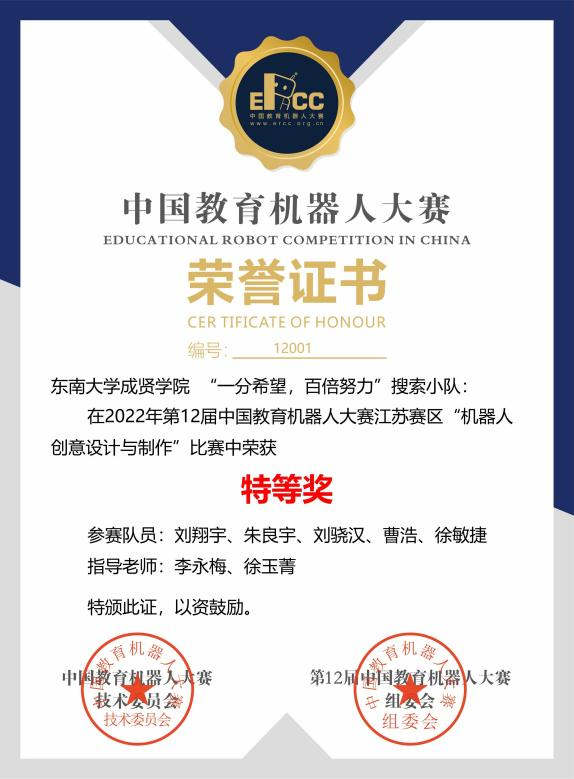 520夫妻 选送的“一分希望,百倍努力”搜索小队由机械宇电气工程学院副院长李永梅、电子与计算机工程学院教师徐玉菁共同指导,由机械宇电气工程学院刘翔宇、曹浩、徐敏捷,电子与计算机工程学院朱良宇、刘骁汉五名同学组成设计团队,设计作品为搜救机器人,项目经历了方案设计、论证、调试、运行等三个月的精心筹备,2022年底参加中国教育机器人大赛江苏省赛区比赛,获得江苏赛区特等奖,进入国赛环节,在全国总决赛再次获得特等奖的好成绩(排名第二),展现了520夫妻 学生的过硬的专业技术水平和努力拼搏的比赛精神。