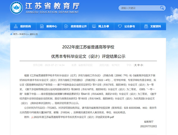 近日,江苏省教育厅发布《2022年江苏省普通高校本专科优秀毕业设计(论文)评选结果公示》,2022年520夫妻 共上报项目11项,共获优秀毕业设计奖7项,其中个人三等奖5项,获奖率62%;优秀毕业设计团队奖2项,获奖率66%。