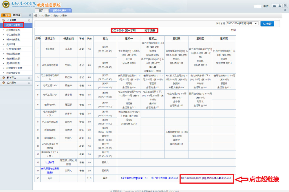 2023-2024-1学期2023级新生课表已编排好,请同学们及时登录学校教务系统查询个人课表并按照课表准时上课。学生个人课表查询步骤如下:
