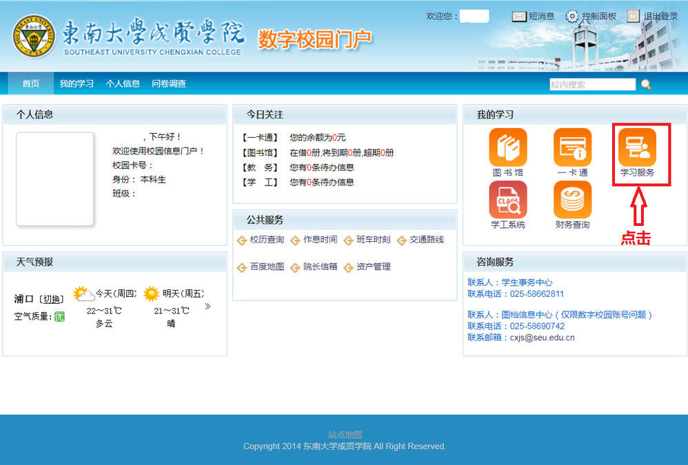 三、点击右侧“我的学习”中的“学习服务”