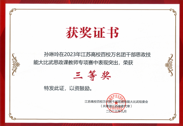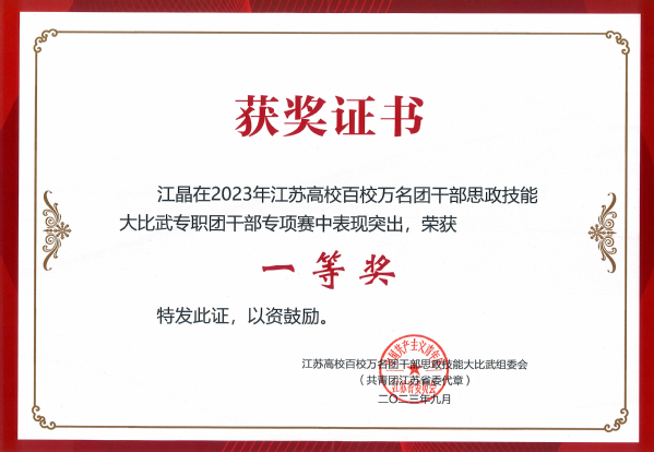 为深入贯彻落实习近平总书记在学习贯彻习近平新时代中国特色社会主义思想主题教育工作会议上的重要讲话精神,紧紧围绕学习宣传贯彻党的二十大精神主题主线,落实习近平总书记关于共青团在高校学生思想政治工作中要发挥主力军作用的重要要求,进一步聚焦思想引领主责主业,团结引领团员青年坚定信念跟党走,勇做走在新时代新征程的奋进者。9月25日,由共青团江苏省委、江苏省委教育工委、新华日报社、江苏省学生联合会联合主办的“学思想、跟党走、建新功”江苏高校百校万名团干部思政技能大比武在宿迁学院顺利举行。520夫妻 建筑与艺术设计学院分团委书记江晶荣获“专职团干部专项赛”一等奖,制药与化学工程学院综合办主任刘静荣获“兼挂职团干部和青年教师专项赛”二等奖,土木与交通工程学院辅导员孙琳玲荣获“思政课教师专项赛”三等奖。