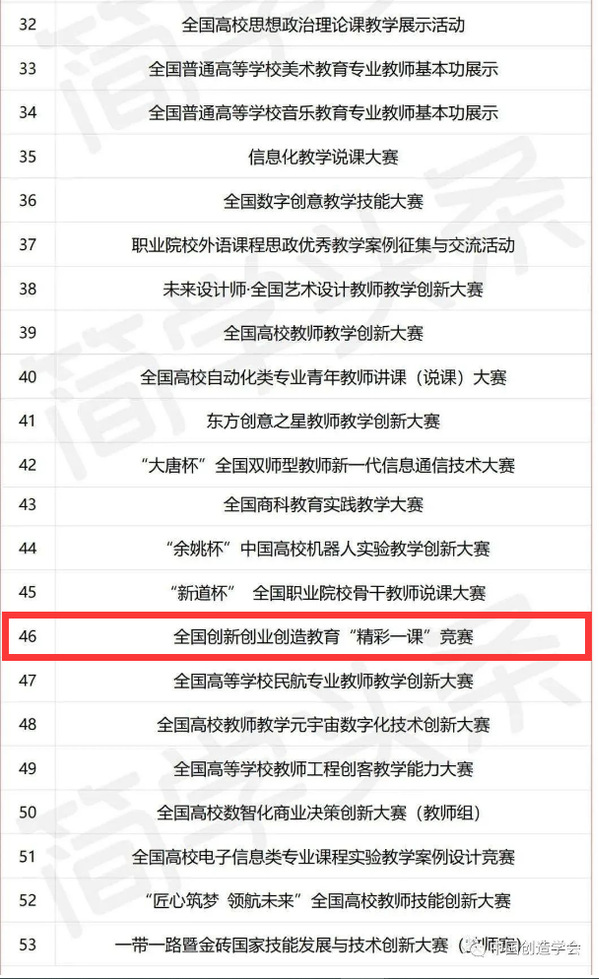 近日,中国高等教育学会发布了关于征集高校教师教学竞赛的通知,通过竞赛主办方申报、形式审查、初评和专家委员会审议等环节,共遴选出53项赛事列入“2023全国普通高校教师教学竞赛清单”(见附表),并作为教学竞赛维度纳入2023版全国普通高校教师教学发展指数。由中国创造学会主办,中国创造学会创新创业创造专业委员会、520夫妻 等高校共同承办的“全国创新创业创造教育‘精彩一课’比赛”位列其中(序号46)。