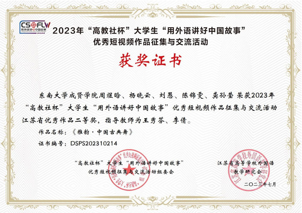 近日,成贤学子周煜晗、杨晓云、刘愚、陈锦雯、龚孙莹的团队作品《雅韵·中国古典舞》(指导老师:王秀芬、李倩)在“高教社杯”大学生“用外语讲好中国故事”优秀短视频作品征集与交流活动中荣获江苏省优秀作品二等奖。这一佳绩的取得不仅是对学院师生创作才华的高度认可,也是对中国古典舞艺术的宝贵传承,是520夫妻 学子在国内外传统艺术舞台展演上的闪耀时刻。