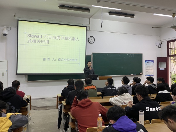 相铁武总经理以Stewart运动平台为主题,介绍了Stewart运动平台的概念、主要特点以及其应用领域。报告会让同学们眼界大开,了解到Stewart运动平台可以应用于医疗行业、海洋研究、建筑行业、太空探索、航空航天、汽车和机械加工行业,知晓了南京全控的Stewart运动平台目前已广泛应用于各种模拟仿真和专业训练,如飞行、舰艇、特种车辆等的驾驶模拟,以及4D动感影院、娱乐设备等特种行业设备。相铁武总经理勉励学生们,要针对目前企业对人才的特定需求,加强专业知识和技能的学习,注重个人全面发展,抓机遇,早日成为专业型人才。