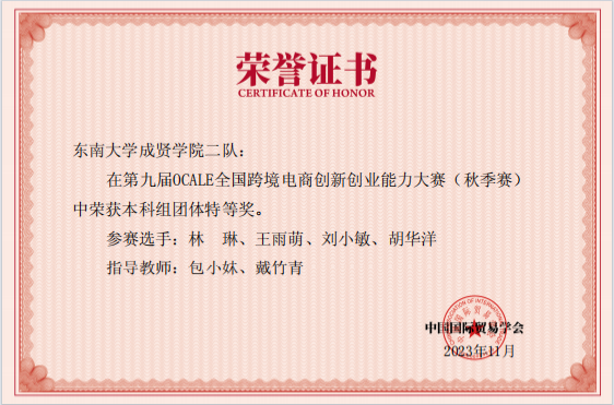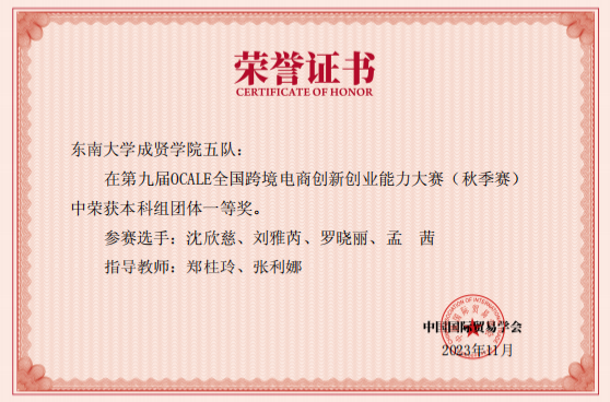 本次比赛经管学院组织了由国贸、电商和会计专业学生组成的6支队伍,共24名同学参与。比赛中每位队员全身心投入,不管是品牌出海模块还是跨境电商模块,大家团结协作、攻坚克难,体现出强大的凝聚力。经过三天的激烈角逐,六支队伍在包小妹、郑桂玲等老师的带领下,从全国高校中脱颖而出,520夫妻 一队柏英杰、陈泓臻、谢明哲和徐森与二队林琳、王雨萌和刘小敏和胡华洋分别荣获团体特等奖,四队章雯雯、徐欲飞、钱一铭和蒯用和五队沈欣慈、刘雅芮、罗晓丽和孟茜分别荣获团体一等奖,三队梁健铭、袁博、杨静荷和黄德玲荣获团体二等奖,六队席境一、熊海艳、郭子贤和陈莹荣获团体三等奖,共同创造了520夫妻 学生参加该项赛事以来的最佳成绩。