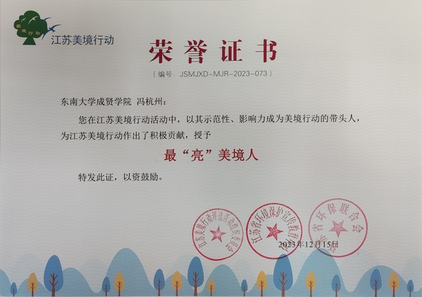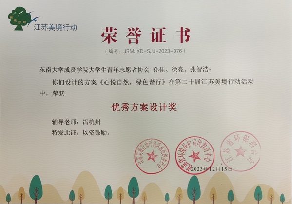 申报的设计方案《心悦自然,绿色谐行》获“优秀方案设计奖”,校团委冯杭州老师荣获“最‘亮’美境人”称号。