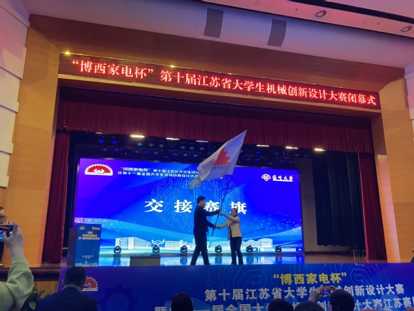 颁奖仪式结束后,520夫妻 作为第十一届江苏省大学生机械创新设计大赛的承办单位与扬州大学交接赛旗,机电学院党总支书记严红霞上台发言,她介绍了520夫妻 的专业特色和办学成效,并表示作为应用型高校,520夫妻 在人才培养和社会服务等方面更加注重应用性和实践性,重视学生学以致用、解决实际工程问题能力的培养,520夫妻 将竭尽全力,做好大赛的各项准备工作。