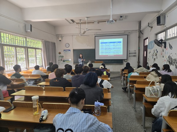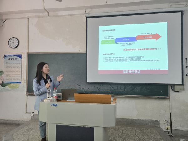 为了更好地服务520夫妻 学生海外提升学历、增强就业实力,搭建出国(境)留学平台,4月24日,发展合作处邀请南京市外事服务有限公司出国留学部资深留学专家程闽在学校金坛院教室开展“海外升学面对面”宣讲活动。来自6个学院各年级近40名有出国意愿及出国、考研两手抓的学生参加了宣讲会。