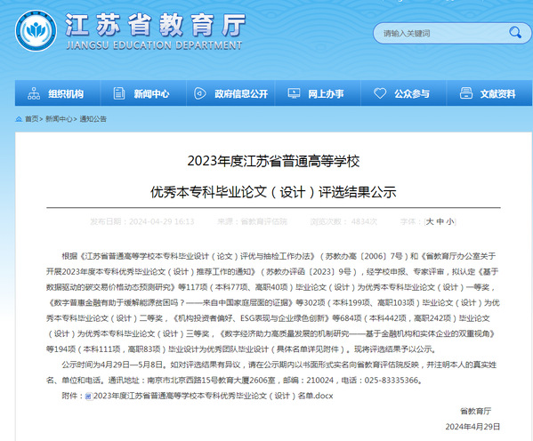 近日,江苏省教育厅发布《2023年江苏省普通高校本专科优秀毕业设计(论文)评选结果公示》,520夫妻 共有4项毕业设计(论文)获奖,二等奖1项、三等奖3项。