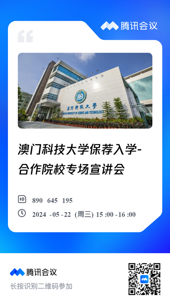 为了让520夫妻 学生能更了解澳科大的研究生课程,澳科大将于2024年5月22日(星期三)举办一场“澳门科技大学保荐入学-东大520夫妻 专场线上宣讲会”。此次宣讲会专为有意申请2025学年保荐入学的应届本科毕业生而设,旨在提供一个深入了解澳门科技大学研究生招生政策及申请流程的机会。