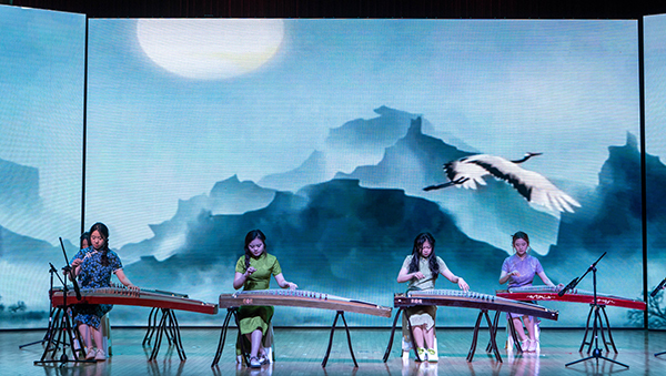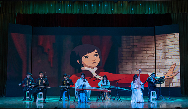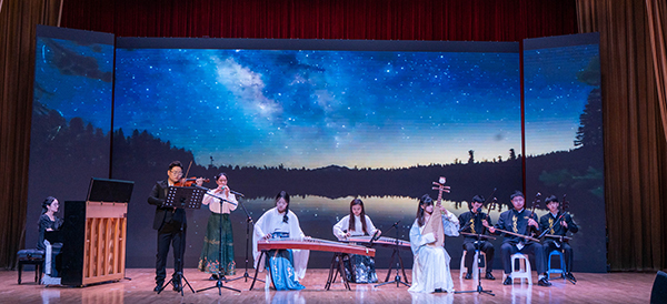 古筝合奏《浏阳河》拉开音乐会序幕,琴弦细腻如春蚕吐丝,悠扬的旋律跃入人心。演奏者巧妙地运用不同的技法,形成鲜明的对比,使乐曲具有更强烈的感染力,深情地表达了对家乡和对生活的热爱。二胡演奏《水龙吟》气势磅礴、恢宏大气,演奏者以娴熟的技艺和饱满的热情展现了中华民族不屈不挠、勇往直前的精神面貌。《钢水奔流》旋律富有朝气、节奏铿锵有力,歌颂了钢铁工人的豪迈气概和冲天干劲。民乐合奏《万疆》用悠扬的旋律勾勒出山河无恙的盛世景象,表达了对祖国蒸蒸日上的赞美与自豪。《人生的旋转木马》节奏轻盈、旋律优美、气氛明快,表达出生命的欢乐与活力。作为结束曲目的《友谊地久天长》用悠扬婉转的旋律展示了友谊的真挚与美好,让在场的观众深受感动。纵使岁月如梭,但友情永存,带着挚友的期待与祝福,不断探索,敢于冒险,勇往直前。
