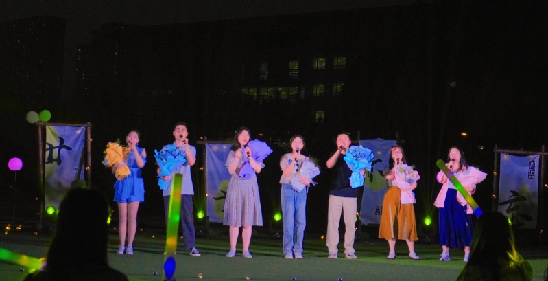 本次音乐节的表演者大多为20级毕业生,活动预告一经发出,便受到了大四毕业生的广泛关注,前期歌单征集收到了近千份回复,大家一同参与,制定了属于自己的毕业歌单。音乐节于晴朗的傍晚在操场拉开了序幕,精心搭建的舞台上灯光璀璨,乐声悠扬。抒情婉转的流行音乐,带动全场合唱;激昂活力的说唱,瞬间点燃现场;安静温柔的民谣,让人沉醉其中。歌声与弹奏交织,在夏日的夜晚讲述着青春的故事,传递着毕业的祝福。《同桌的你》、《海阔天空》、《晴天》等一首首耳熟能详的歌曲,直击人的内心深处,让深情独白变成了千人大合唱,点燃现场每一位观众的心。除了学生表演,音乐节还邀请了毕业班辅导员作为特邀嘉宾一起合唱,用一首《凤凰花开的路口》表达了对20级毕业生的美好祝愿和深深的不舍。