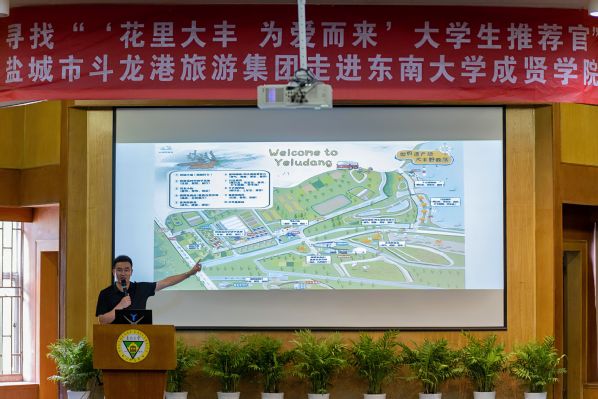 会上,在真知馆报告厅260余名师生积极参与了校企融合课堂,通过观看宣传片感受花里大丰的独特魅力。盐城大丰世遗黄海湿地公园有限公司经理朱文琦结合大丰区荷兰花海、梅花湾、大丰野鹿荡等著名景点进行了“花里大丰 为爱而来”的主题宣讲,将大丰的美景、美食、美宿娓娓道来,带领同学们了解大丰得天独厚的生态禀赋和丰富多彩的文旅资源。盐城市斗龙港生态旅游度假集团有限公司副总经理倪海浦介绍了大丰文旅行业的现状和斗龙港旅游集团在文旅、酒店方面的人才需求,并向应届毕业生们发出盛情邀约。