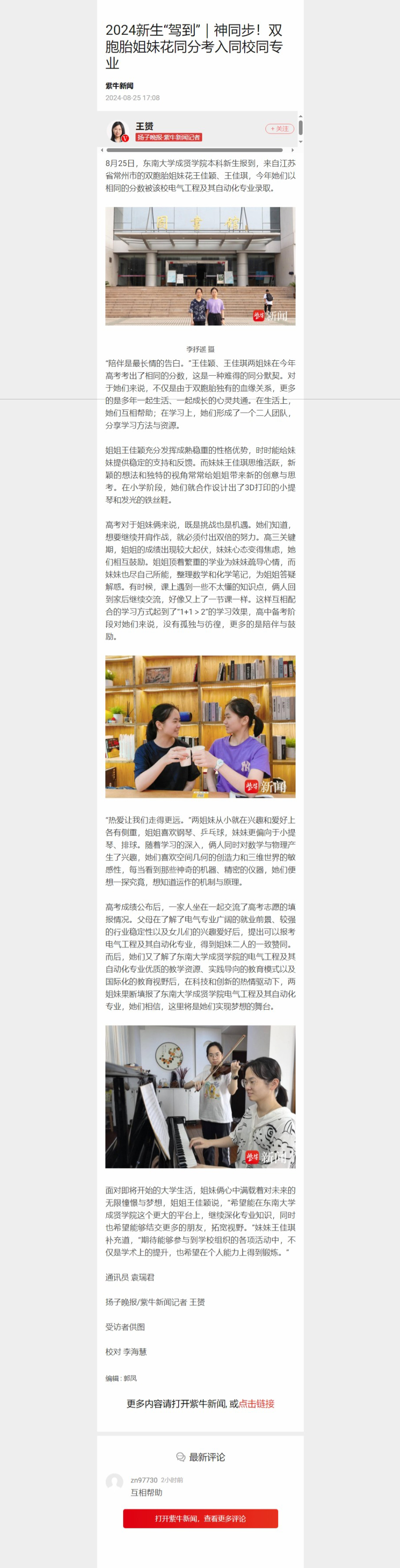 【扬子晚报】2024新生“驾到”|神同步!双胞胎姐妹花同分考入同校同专业