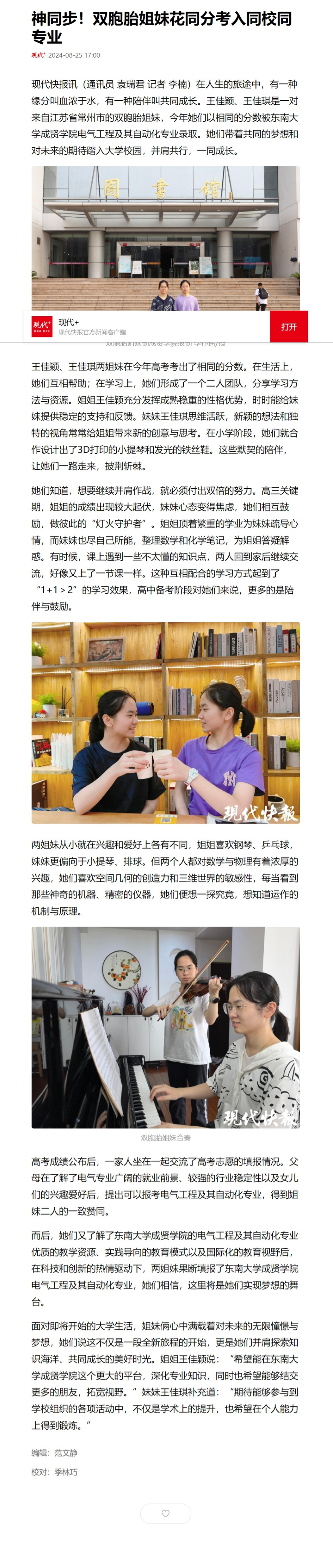 【现代快报】神同步!双胞胎姐妹花同分考入同校同专业