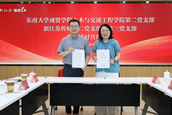 座谈结束后,双方签署了合作协议。土木与交通工程学院第二党支部书记赵毅分别与新江苏传媒第二党支部书记陈岩、第三党支部书记潘军艳签署了党支部结对共建协议书。这一协议的签署标志着双方党支部将在共促队伍培养、共享优势资源、共抓阵地建设、共推事业发展等多个领域展开深度合作。双方将充分发挥各自的优势,探索创新党建工作的新模式,为双方党员的成长与发展搭建更广阔的平台。
