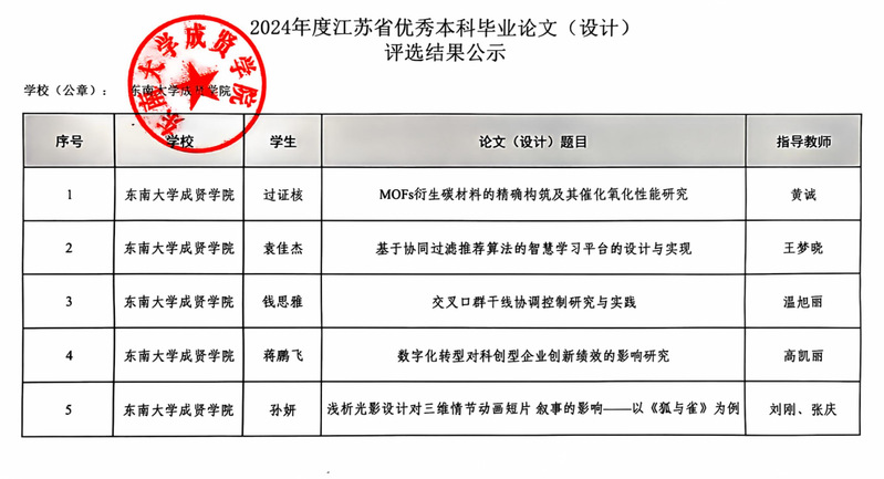 根据《江苏省普通高等学校优秀本科毕业论文(设计)评选办法(试行)》(苏教高函〔2024〕8号)和《省教育厅办公室关于开展2024年度优秀本科毕业论文(设计)推荐工作的通知》(苏教办评函〔2024〕9号),经省教育厅组织专家审核,拟认定520夫妻 5项毕业论文(设计)为省普通高校优秀本科毕业论文(设计)(具体名单详见附件)。按要求现将评选结果予以公示。