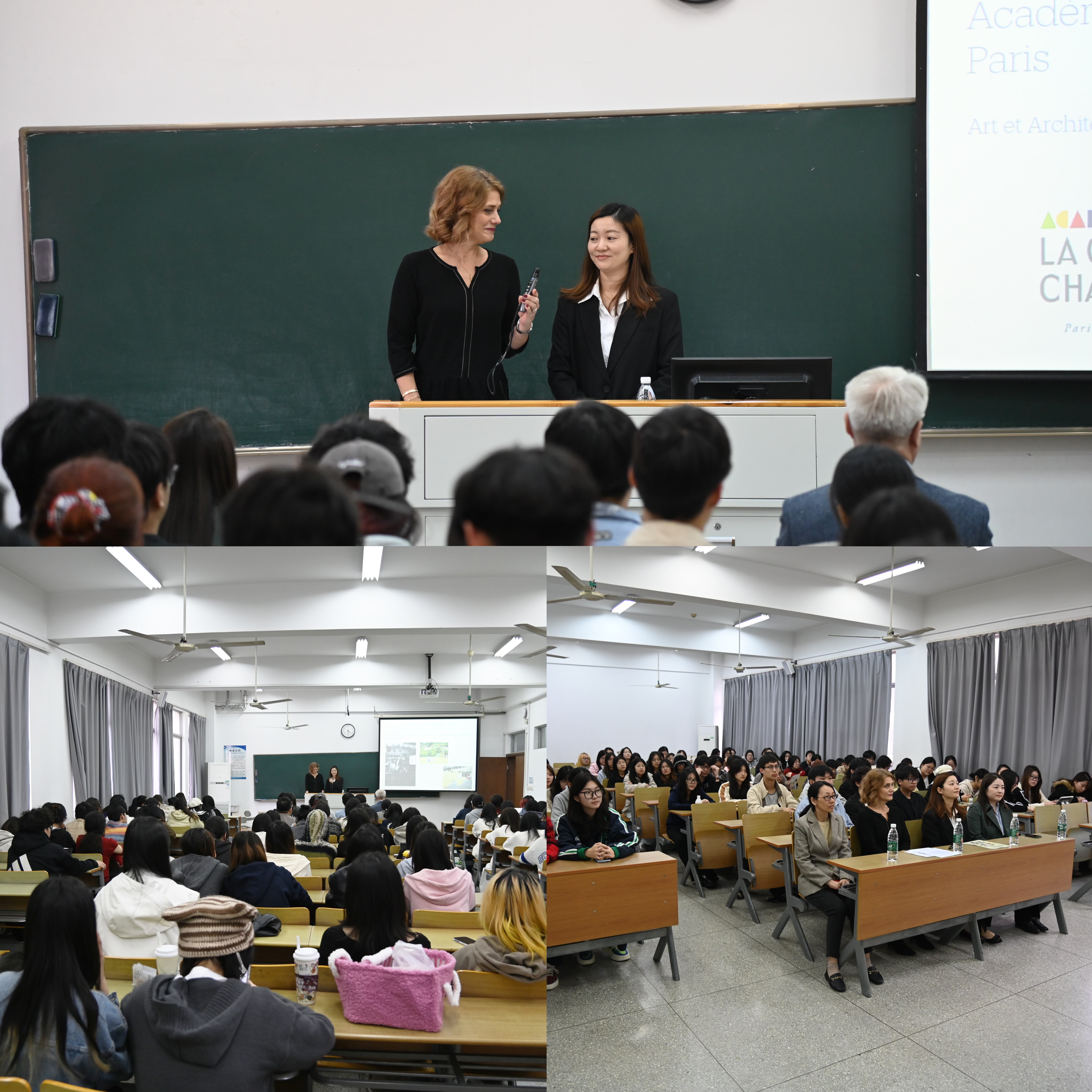 最后,法方学校一行来到建筑与艺术设计学院教室与学生面对面分享交流,从学期交流、多维度课程、申请条件到社会实践、就业指导、奖学金等方面,全面向学生介绍了项目基本内容,帮助学生全方位了解巴黎夏庞蒂埃学院。