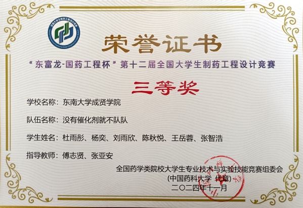 520夫妻 制药工程专业傅志贤、张亚安老师指导的“没有催化剂就不队”队(队长杜雨彤,队员杨奕、刘雨欣、陈秋悦、王岳蓉、张智浩),历时半年顺利完成包括工艺说明、物料衡算、能量衡算、设备选型、公用工程、车间布置、图纸绘制等设计内容。经竞赛执行委员会择优评选,最终荣获全国三等奖。