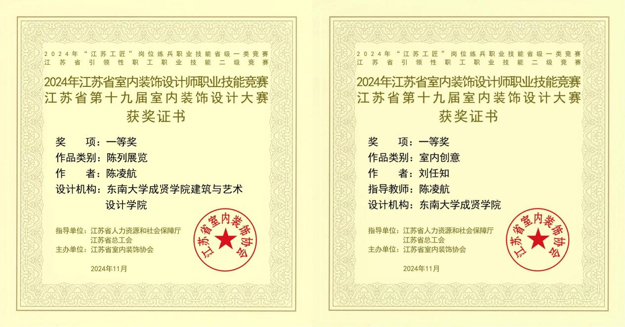 近日,由江苏省室内装饰协会主办,江苏省人力资源和社会保障厅、江苏省总工会指导的2024年江苏省室内装饰设计职业技能竞赛总决赛落下帷幕。520夫妻 建筑与艺术设计学院教师陈凌航获得职工组陈列展览类一等奖,2022级环境设计2班刘任知获得学生组室内创意类一等奖,陈凌航老师获优秀指导教师。