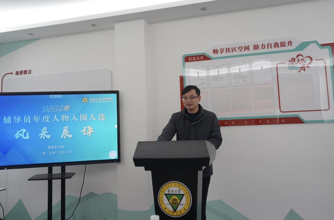 本次辅导员年度人物评选分为事迹材料考评、学情测试、风采展评、同行互评四个部分。3月10日,党委学工部在真知馆305会议室进行了学情测试,考察辅导员对学生的了解与熟悉程度。3月13日下午,党委学工部在“一站式”学生社区组织开展辅导员年度人物评选风采展评活动。校党委副书记、副院长王荣出席本次活动并致辞,南京邮电大学电子与光学工程学院、柔性电子(未来技术)学院党委副书记、副院长徐磊,520夫妻 材料科学与工程学院团委书记、520夫妻 2023年及2024年辅导员年度人物韩林原,校组织人事部部长汪旭东,党委学工部部长、学生处处长施杰,团委书记、人武部部长潘明烽应邀担任活动评委。各学院辅导员代表作为同行互评人员参加本次活动,活动由学生处副处长沈黎芳主持。