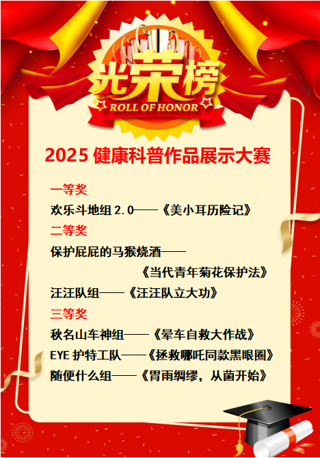 大赛秉持“科学性、创新性、实用性、传播性”的评审原则,要求参赛作品既要确保专业知识的准确性,又要兼顾传播的趣味性和有效性。在护理专业教师的悉心指导下,各参赛团队围绕当前社会关注的健康热点问题,精心打造了一批主题鲜明、形式多样的科普作品,内容涵盖多个领域,充分体现了护理学科的广度与深度。