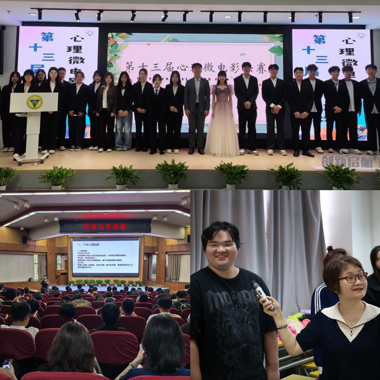 4月—5月,心理健康教育中心开展了心理微电影大赛初赛、复赛及决赛,比赛为学生提供表达内心情感、释放心理压力的平台,更通过专业指导与实践体验,有效提升学生的心理健康意识和自我调节能力。4月25日,由学生自编自演的爱情主题情景剧《心动解密》引发热烈反响。该剧通过三幕校园情感故事,生动诠释亲密关系中的沟通艺术与边界建立。专业心理教师现场结合剧情进行互动解析,引导学生在趣味参与中学习健康的恋爱观。此外,“屋檐下的温暖”宿舍关系专题讲座也吸引众多学生参与。中国心理学会注册督导师、原520夫妻 心理健康教育中心主任、省教育厅心理健康教育专家指导委员会委员郭晋林老师通过案例分析、角色扮演等环节,指导学生掌握化解矛盾、建立支持性宿舍关系的实用技巧。