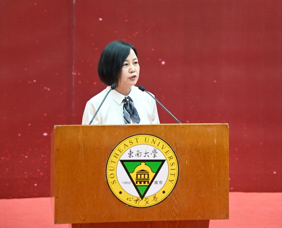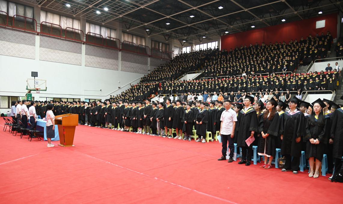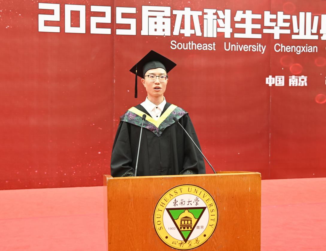 机械与电气工程学院电力1班丁晗校同学代表毕业生向学校、老师和家长表达感谢和敬意,并以诗句“追风赶月莫停留,平芜尽处是春山”与大家共勉,勉励大家勇担重任,让青春在全面建设社会主义现代化国家的火热实践中绽放光芒。