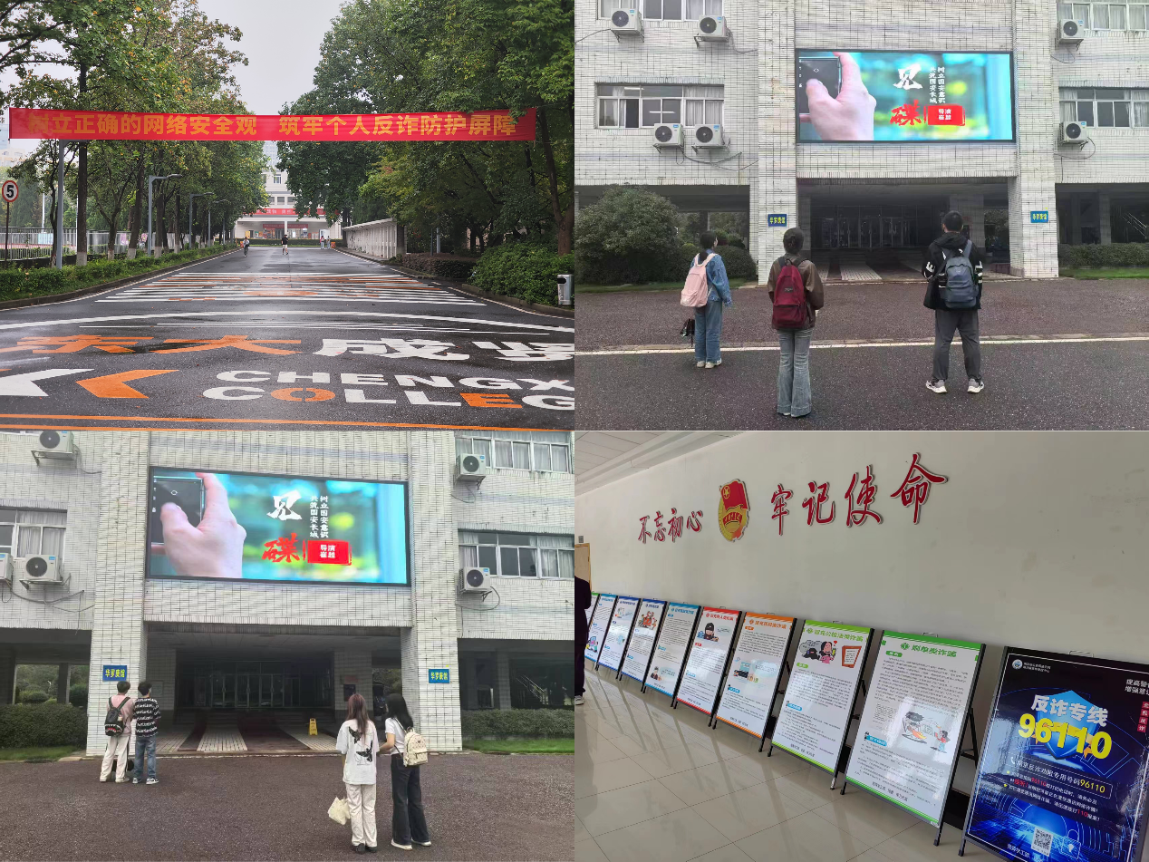 为让网络安全与反诈知识“看得见、触得到、记得住”,学校在校园公共区域打造了立体化线下宣传阵地。在食堂等师生流量密集区域,设置“网络安全与反诈宣传专区”,通过展板展示十大高发电信网络诈骗类型(含刷单返利、虚假投资理财、冒充电商客服等)、八大反诈利器(国家反诈中心 APP、96110 预警专线等)及《中华人民共和国反电信网络诈骗法》核心条款,用图文并茂的形式拆解诈骗手法;在校园主干道悬挂“树立正确网络安全观,筑牢个人反诈防护屏障”主题横幅,在广场电子大屏循环播放反诈公益视频与网络安全科普动画,让师生在日常出行、就餐、学习过程中潜移默化接受安全教育,营造“人人谈安全、时时防诈骗”的浓厚氛围。