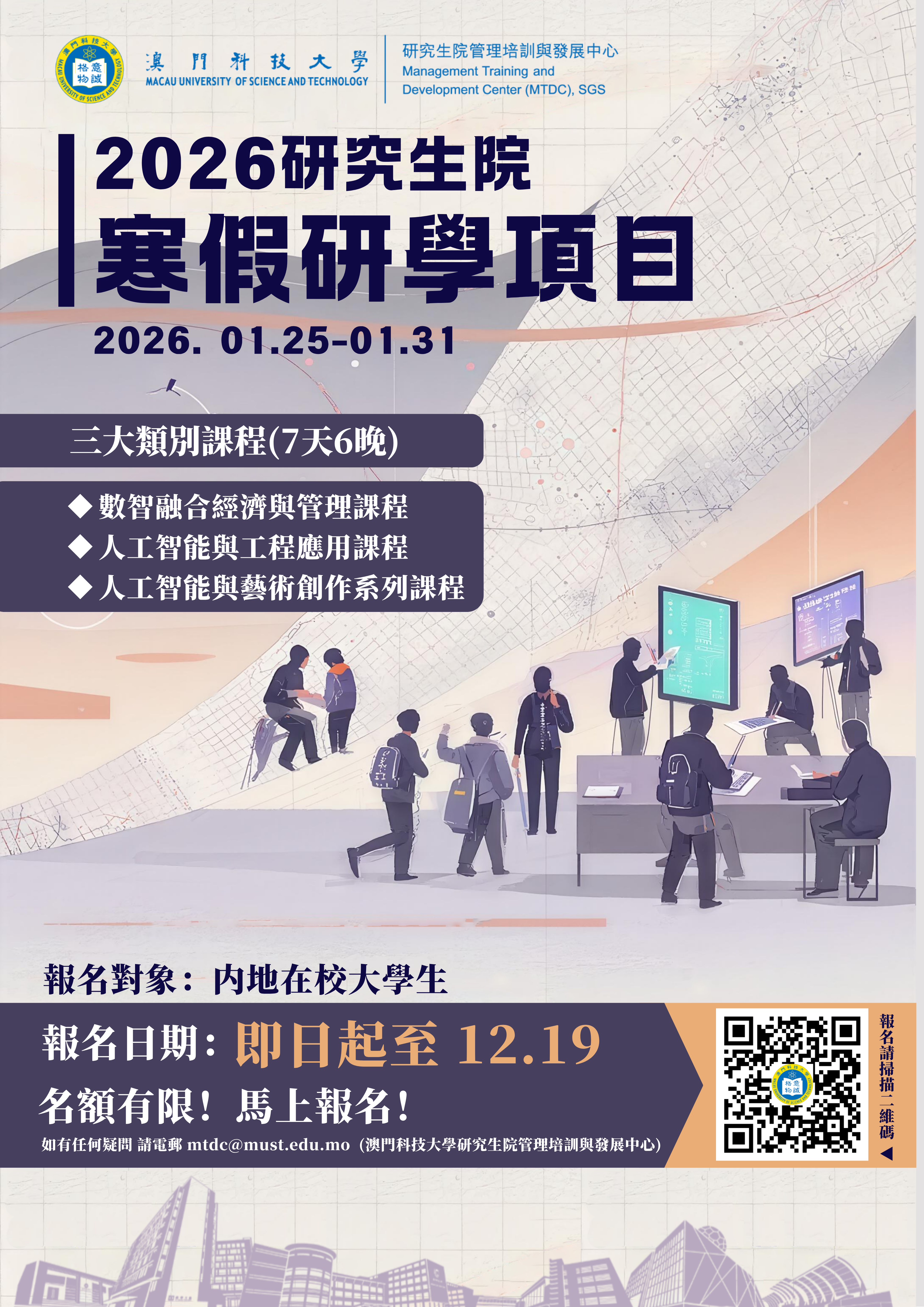 课程详情、课程目标及日程安排详见附件正文《2026年澳门科技大学研究生院寒假研学项目》。项目结束后,学员将获得澳门科技大学研究生院管理培训与发展中心(MTDC)颁发的证书。