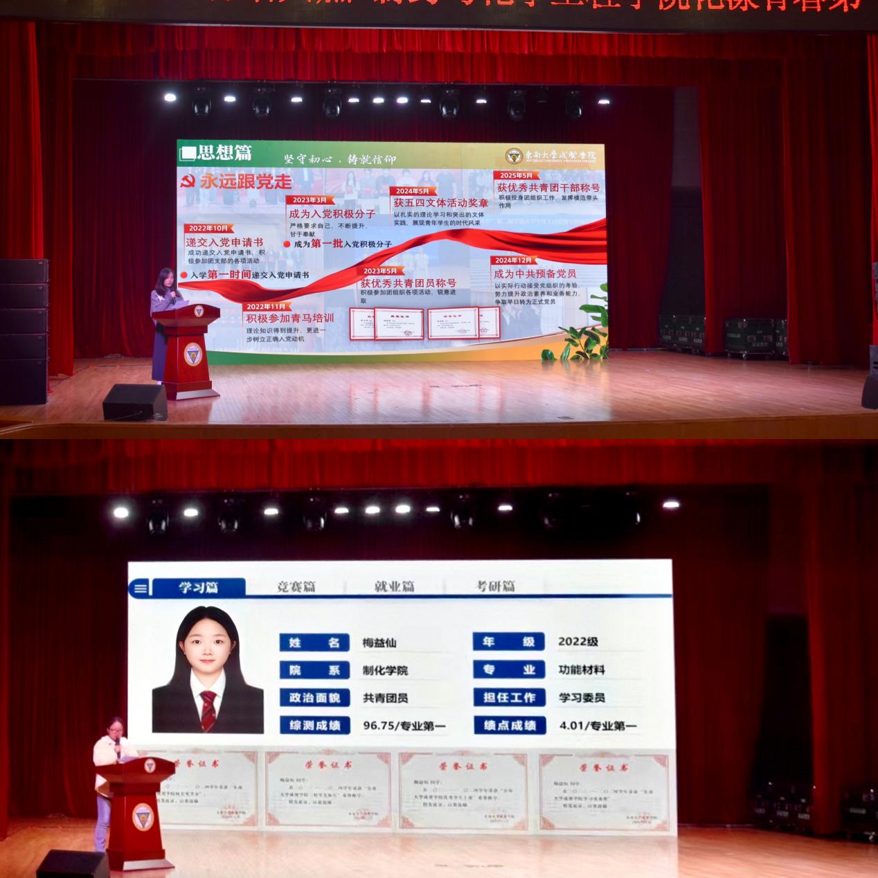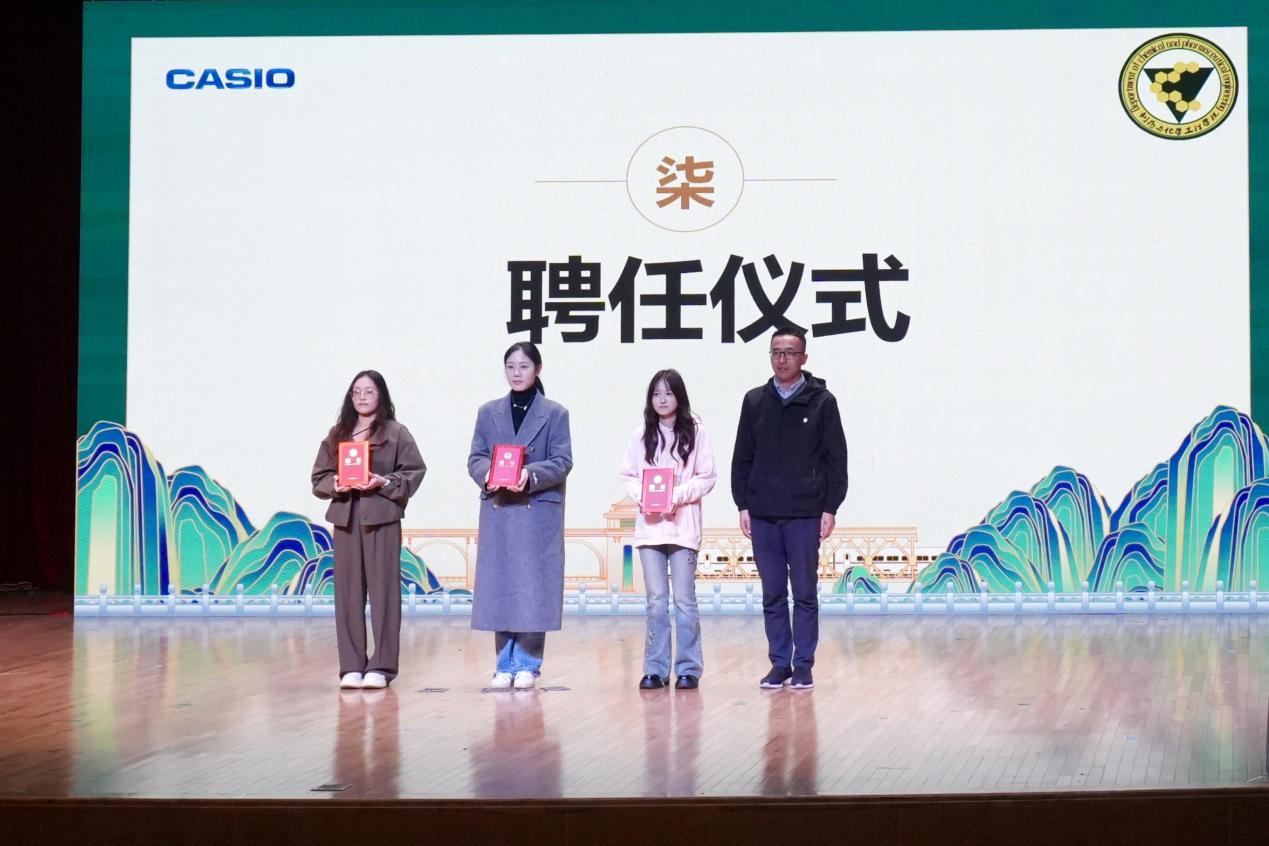 晚会上,学姐们怀揣对大学时光的深切感悟与对学弟学妹的真挚祝福,分享成长历程与奋斗故事。国家奖学金获得者杨雨婷结合自身连续三年绩点4.23、综测96.31的双第一表现、49门课程90+的佳绩及获得多项竞赛奖项经历为新生答疑解惑、指引方向;科创之星梅益仙用绩点4.01、综测96.75的专业双第一成绩与丰硕科创成果,展现竞赛与学术领域的突破之路,干货满满的分享让在场新生受益匪浅。最后,优秀校友代表饶书雅、邓文婷、崔译文受聘为制药与化学工程学院校友导师并现场分享个人考研及就业经历,学院党总支书记周继荣为三人颁发聘书。