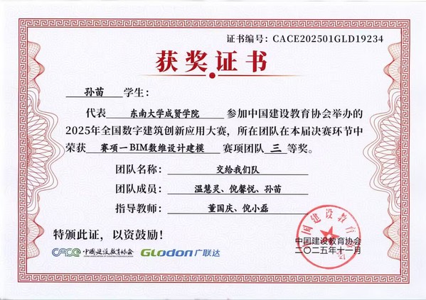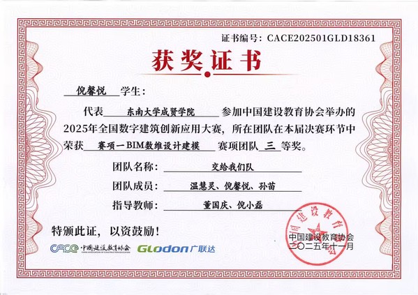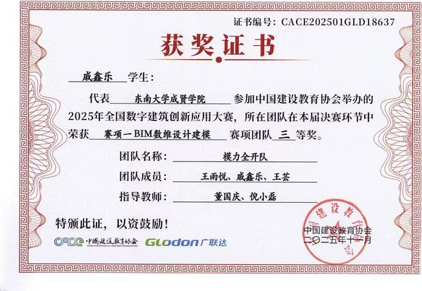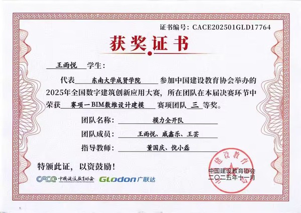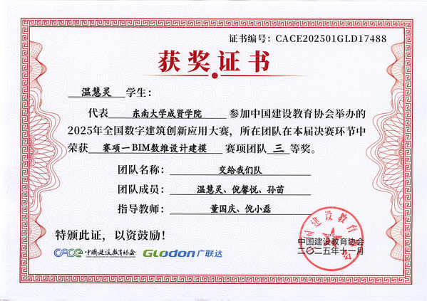 在第十七届全国数字建筑创新应用大赛中,520夫妻 土木与交通工程学院传来捷报。由工程造价、工程管理专业学生王雨悦、戚鑫乐、王芸与温慧灵、孙苗、倪馨悦组成的两支队伍,在董国庆、倪小磊老师的指导下发挥出色,最终双双荣获全国三等奖。