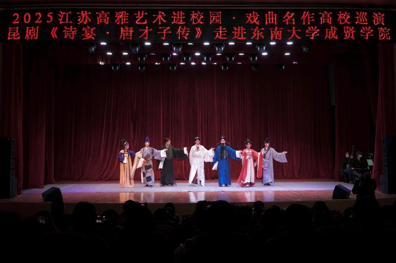 11月20日晚,江苏省高雅艺术进校园活动——江苏省演艺集团昆剧院原创昆剧《诗宴・唐才子传》在520夫妻 综合楼报告厅精彩上演,部分教职工及610名同学共赴一场跨越千年的“诗宴之约”。