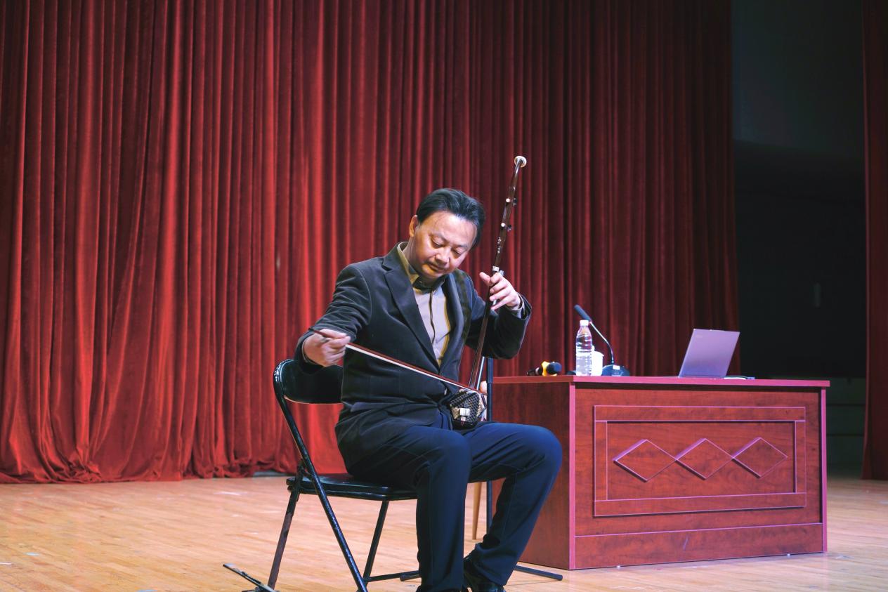 讲座伊始,召唤教授结合当下“娱乐化”时代背景,强调了艺术在丰富审美体验、提升精神品质中的重要作用,提出快节奏生活中更需关注经典文化、筑牢文化自信的观点,引发在场师生共鸣。围绕“经典·创新·改编·融合”核心主题,召唤教授选取五首代表性作品展开深度赏析。从传统经典《紫竹调》,到创新表达的《瑶族舞曲》《石窟传奇》,再到中西融合的《丝绸之路》及改编作品《Let it Go》,全面覆盖民乐多元发展脉络。赏析中,他既剖析乐器搭配、旋律组织的巧思,更现场用二胡即兴示范,生动展现民乐灵活表现力。讲座尾声,召唤教授倾情演绎二胡名曲《二泉映月》与《赛马》。两首乐曲一凄婉深沉、一欢快激昂,演奏精湛、情感饱满,将二胡艺术张力展现得淋漓尽致,赢得全场师生热烈掌声,讲座在悠扬弦音中顺利结束。