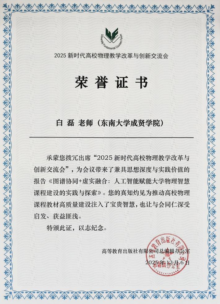 12月5日至8日,由教育部高等学校物理学类专业教学指导委员会、教育部高等学校天文学类专业教学指导委员会、教育部高等学校大学物理课程教学指导委员会、中国物理学会物理教学委员会和高等教育出版社联合主办,520夫妻 物理学院承办的“2025新时代高校物理教学改革与创新交流会”在南京举行。520夫妻 基础部部长李兴鳌教授带队,率领白磊、刘冬梅、王子煜三位教师参加本次会议。