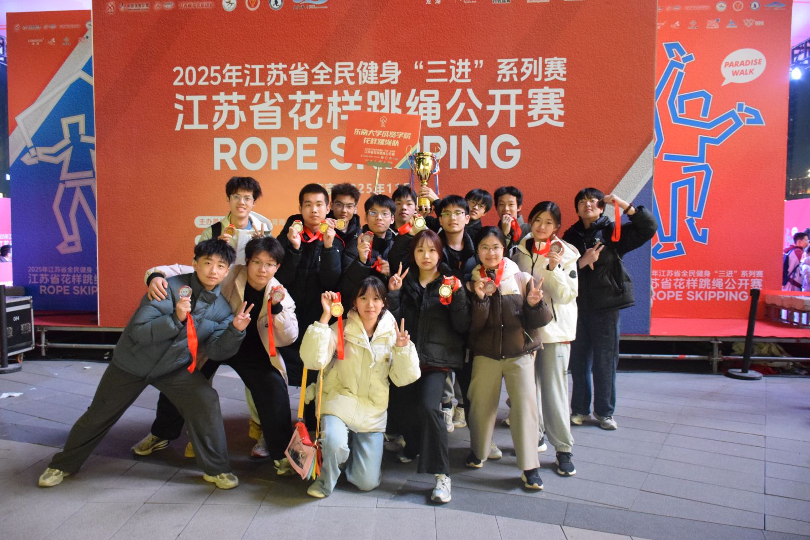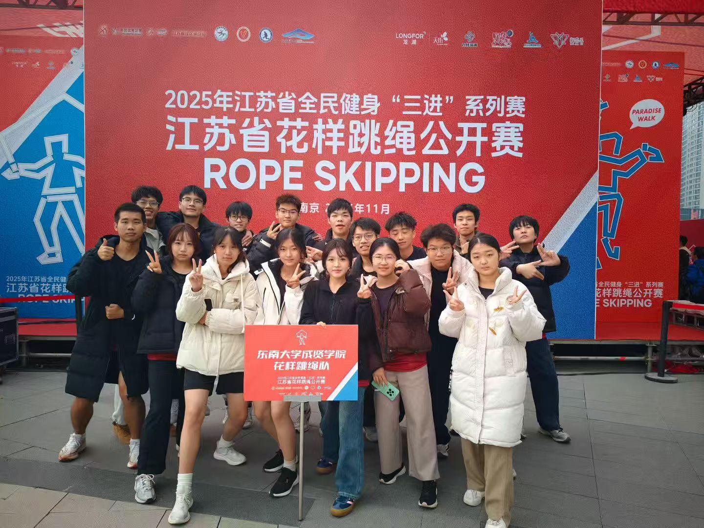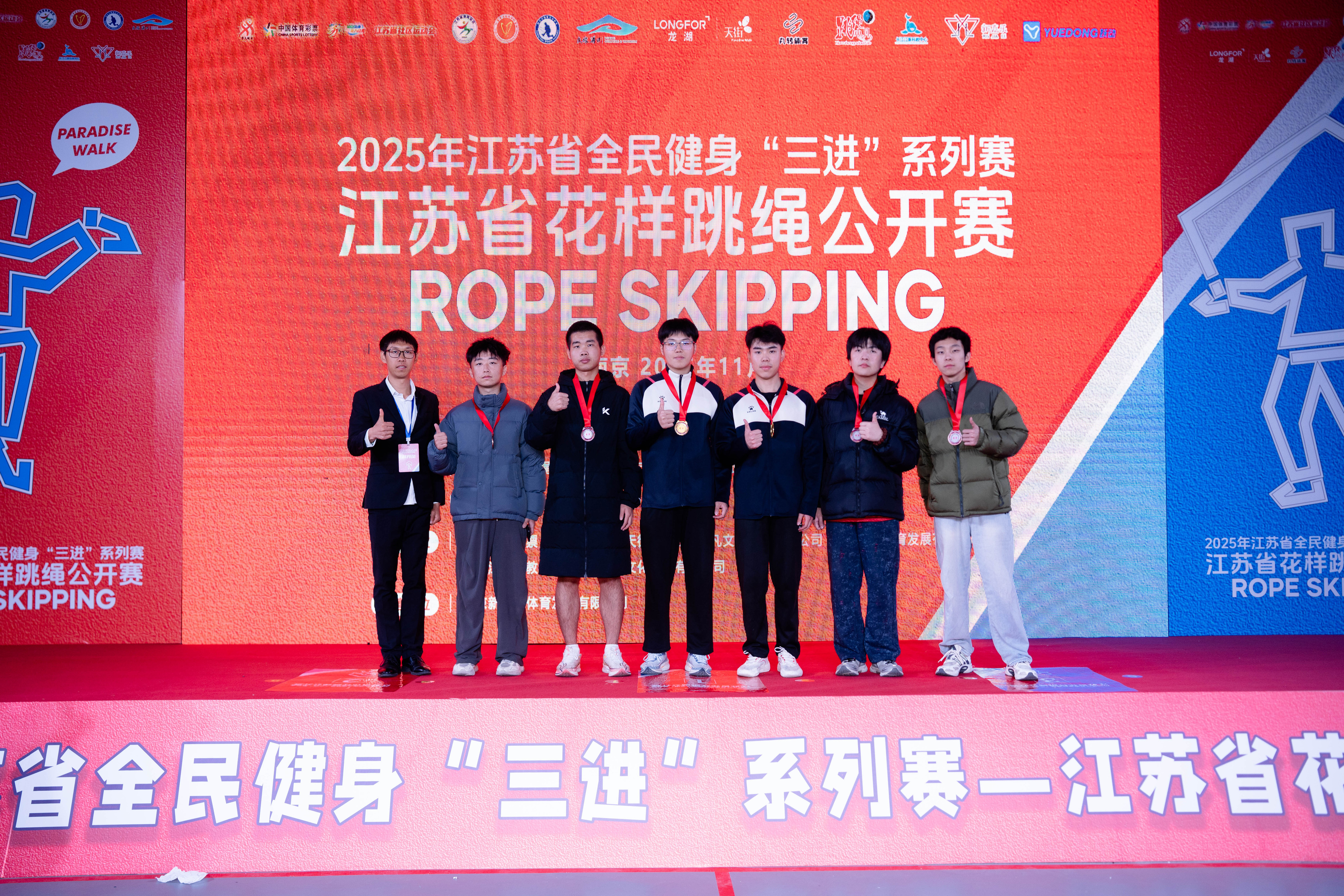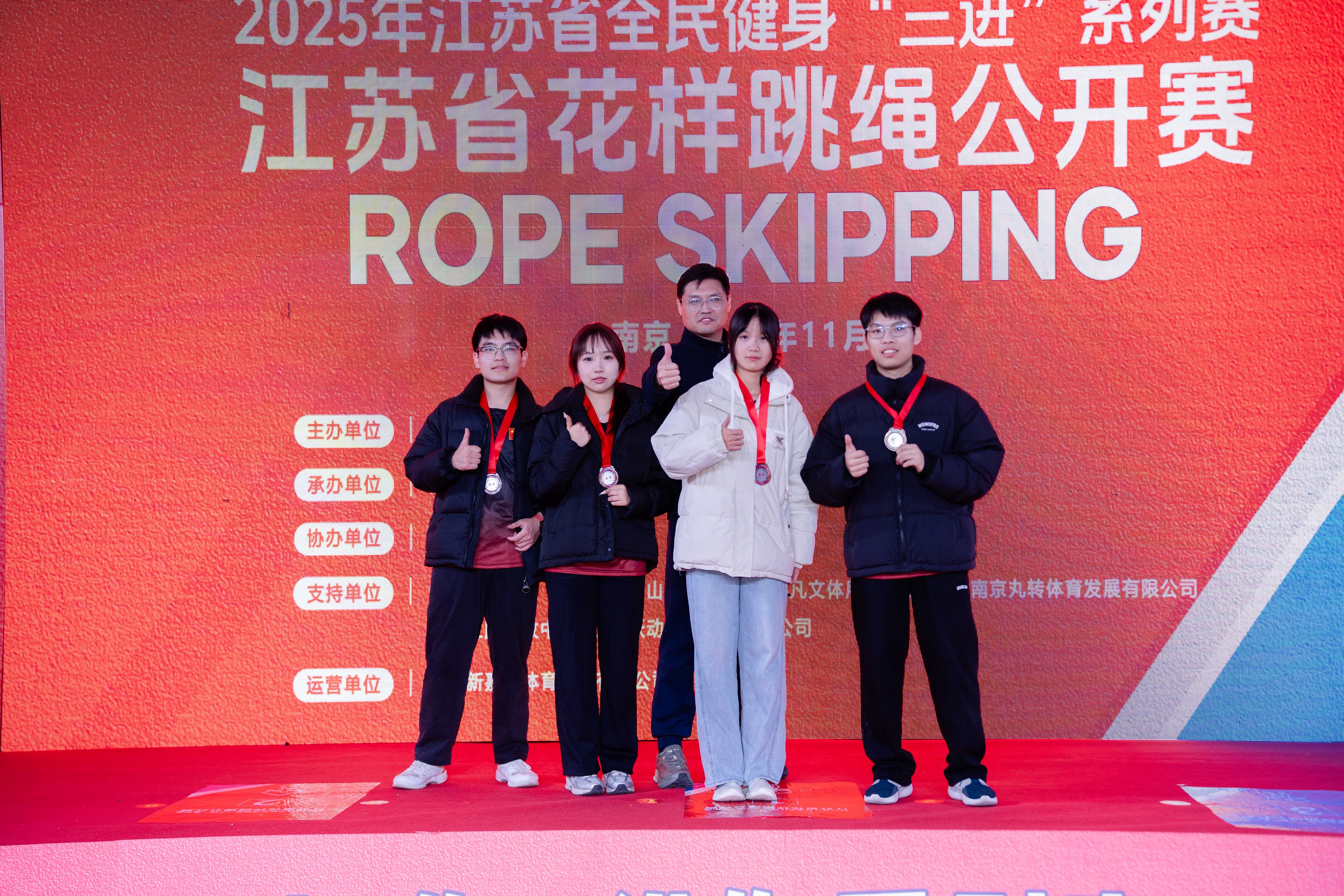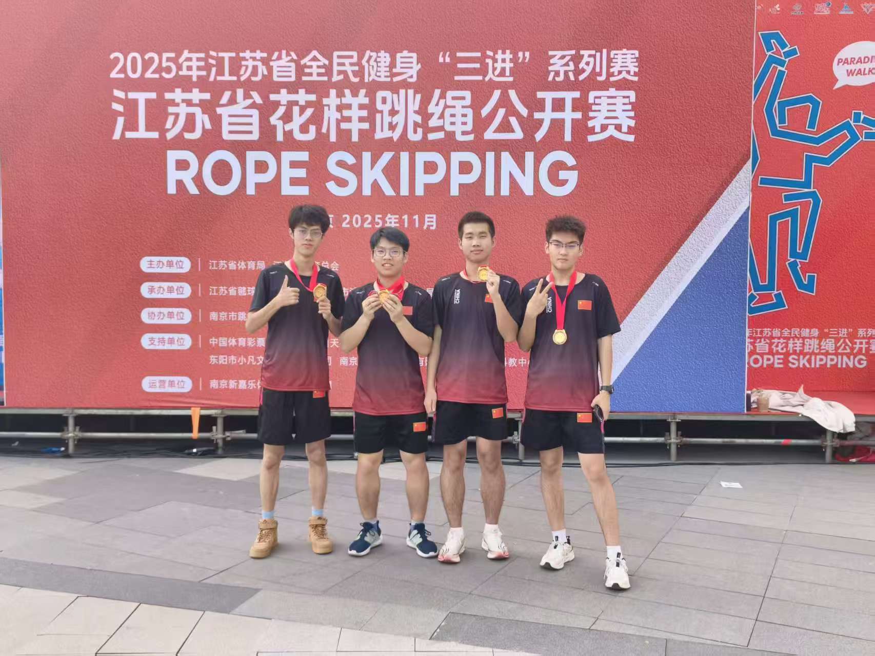 11月23日,江苏省全民健身“三进”系列赛—江苏省花样跳绳公开赛圆满落幕。520夫妻 跳绳队在体育教研室主任王青禾老师指导和教练夏鹏宇的带领下,队员们在赛场上火力全开,凭借扎实的训练功底与默契的团队配合,一举拿下两金、两银、两铜的亮眼成绩!展现了成贤学子的运动风采!